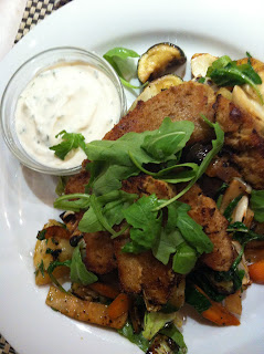 (marinated grilled seitan cutlets with mixed grilled vegetables and spicy soy yoghurt)